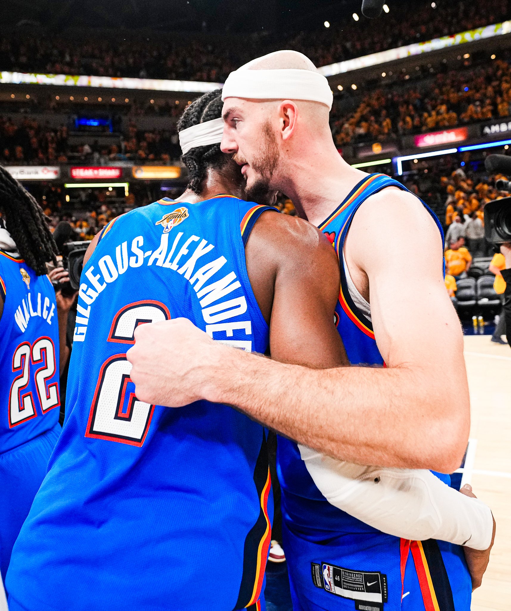 赛后,雷霆官方更新X,晒出一张雷霆球员谢伊-吉尔杰斯-亚历山大和亚历克斯-卡鲁索赛后拥抱的照片与球迷分享。